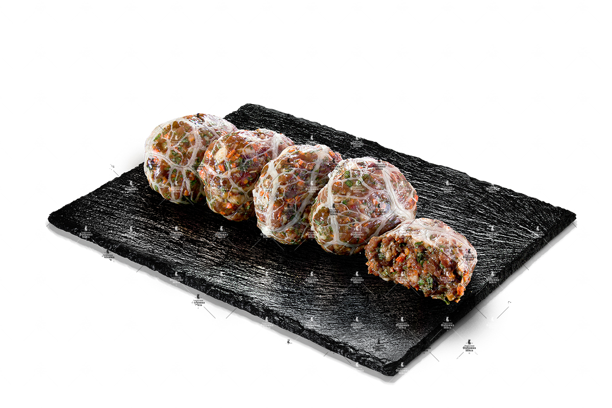 Полуфабрикаты мясные рубленые формованные. Категория Б. СТО 74238183-005-2019. Состав: печень говяжья, свинина (шпик), жировая сетка свиная, морковь сушеная, майонез (подсолнечное масло, вода питьевая, яичный желток, соль поваренная пищевая), молоко сухое цельное, соль поваренная пищевая, растительный белок: соевый, пищевые волокна: растительная клетчатка, животный белок, сахар- песок, чеснок свежий, пряности (перец черный), декстроза, усилитель вкуса и аромата Е621 (10%), пряности (семена горчицы), кориандр, имбирь, мускат, чеснок), Регуляторы кислотности Е451i, Е262 (Р2О5 22%), соль, регулятор кислотности Е500, антиокислитель Е316 (6%), усилитель вкуса и аромата Е621 (5%), мальтодекстрин, регулятор кислотности Е575, ароматизатор (лимон), натуральные растительные экстракты, цитрат натрия 3-замещенный Е331. Срок годности: 72 часа при температуре от +2°С до +6°С. Пищевая и энергетическая ценность в 100 гр. продукта (среднее значение): белки: 15 гр., жиры: 7 гр., углеводы: 5 гр., 145 кКал / 606 кДж. Рекомендации по приготовлению: жарить в небольшом количестве масла с двух сторон до румяной корочки, до готовности доводить в жарочном шкафу.